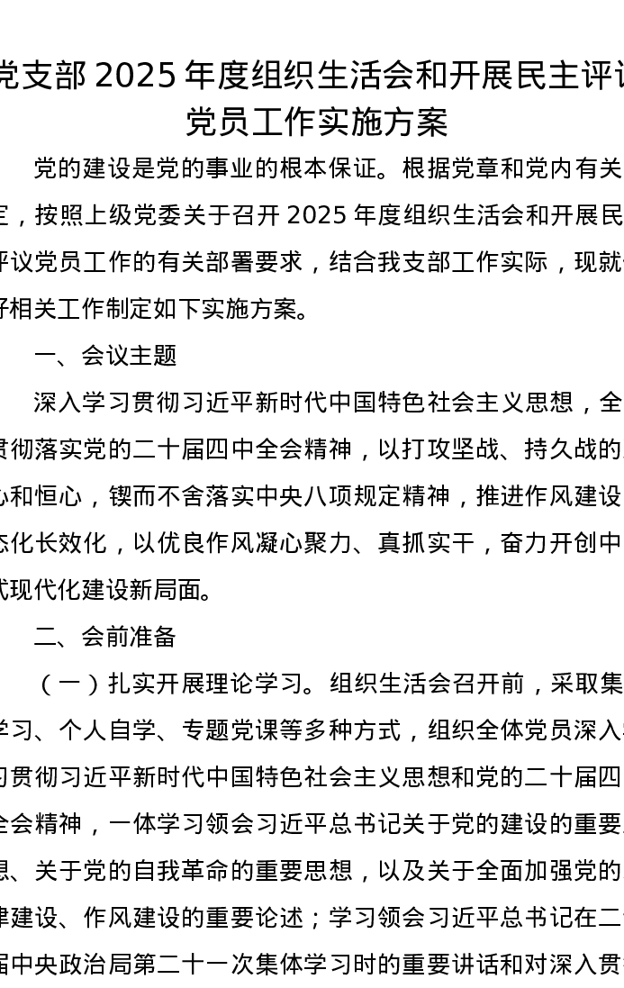 党支部2025年度组织xxx和开展民主评议党员工作实施方案