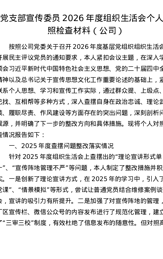 党支部宣传委员2026年度组织xxx个人对照检查材料(公司)