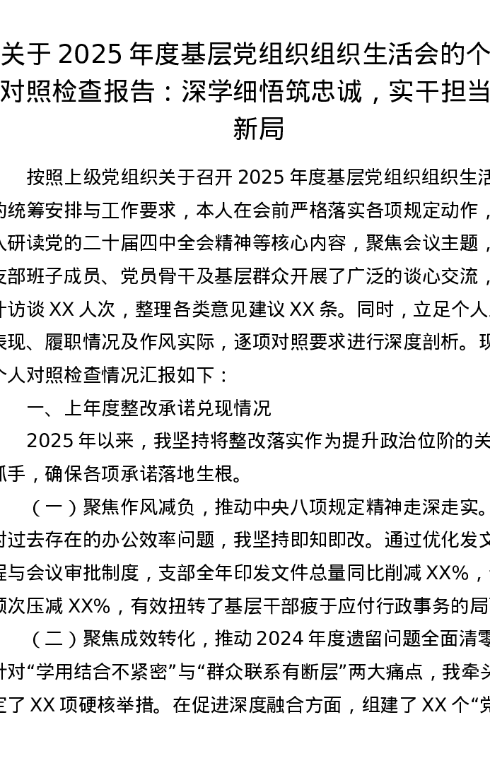 关于2025年度基层党组织组织xxx的个人对照检查报告:深学细悟筑忠诚,实干担当开新局