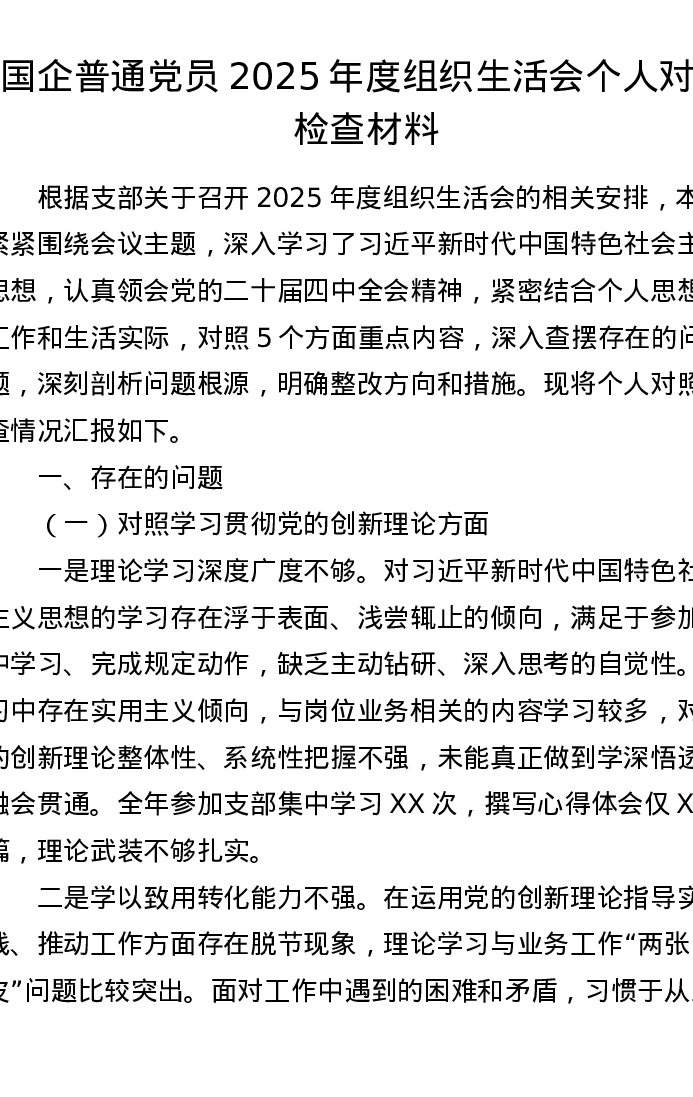 国企普通党员2025年度组织xxx个人对照检查材料