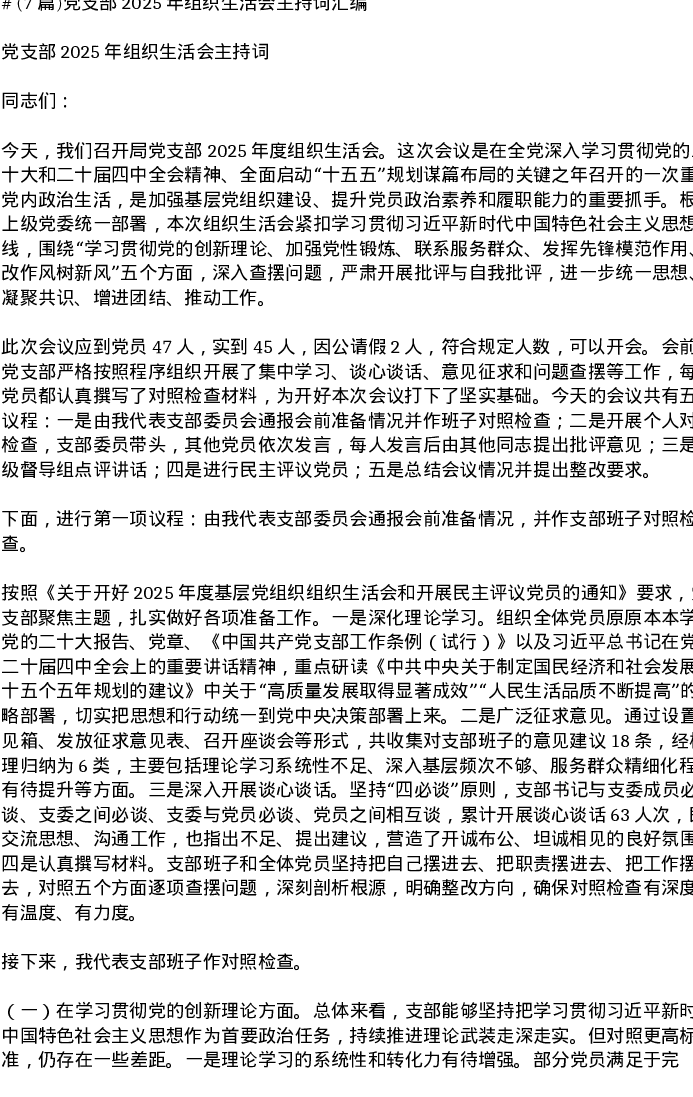 汇编:党支部2025年组织xxx主持词7篇