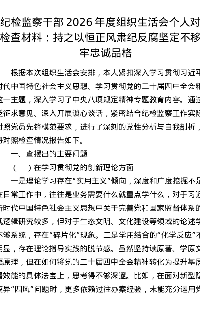 纪检监察干部2026年度组织xxx个人对照检查材料:持之以恒正风肃纪反腐 坚定不移筑牢忠诚品格