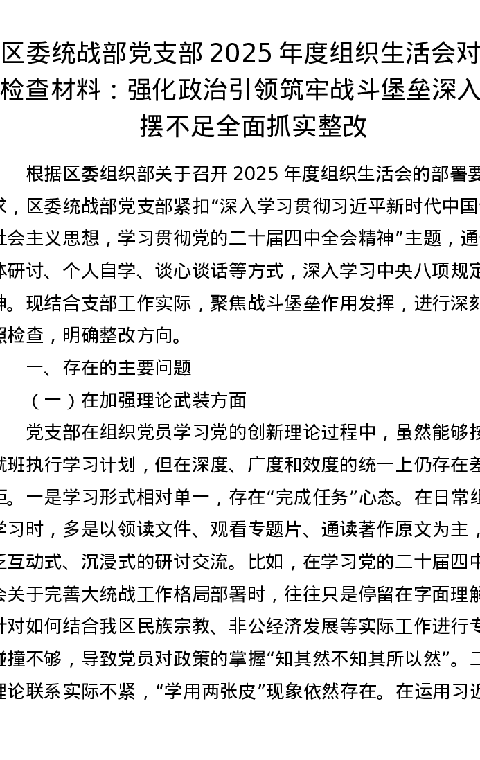 区委统战部党支部2025年度组织xxx对照检查材料:强化政治引领筑牢战斗堡垒 深入查摆不足全面抓实整改