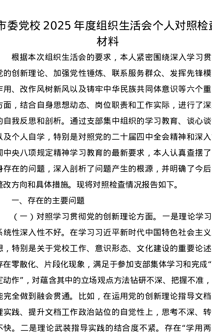 市委党校2025年度组织xxx个人对照检查材料