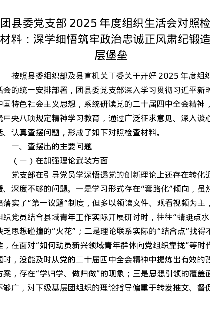 团县委党支部2025年度组织xxx对照检查材料:深学细悟筑牢政治忠诚 正风肃纪锻造基层堡垒