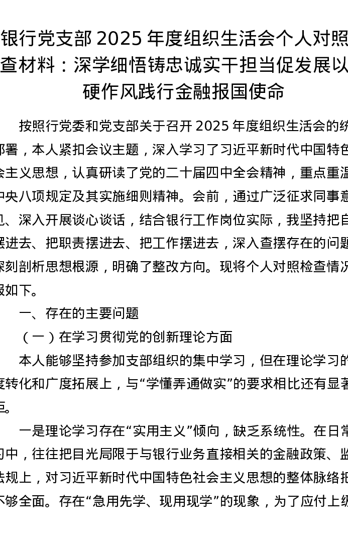 银行党支部2025年度组织xxx个人对照检查材料:深学细悟铸忠诚实干担当促发展 以过硬作风践行金融报国使命