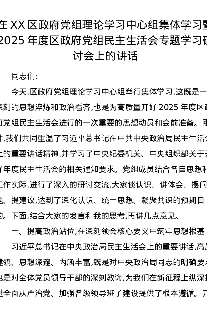 在XX区政府党组理论学习中心组集体学习暨2025年度区政府党组xxxxx专题学习研讨会上的讲话