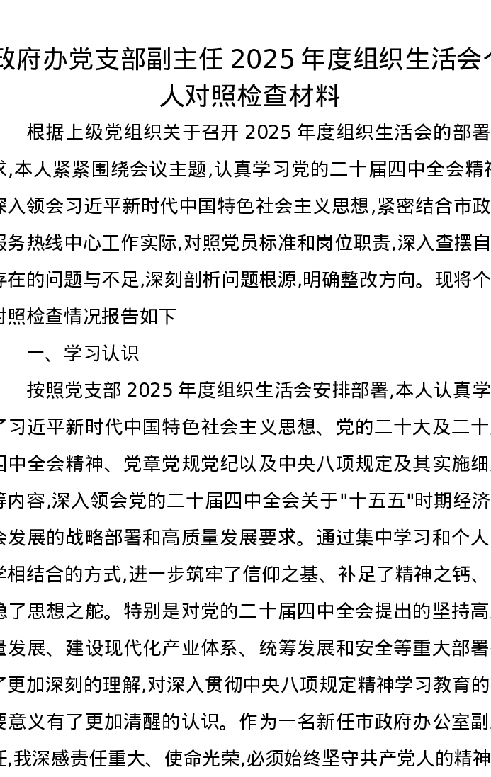 政府办党支部副主任2025年度组织xxx个人对照检查材料
