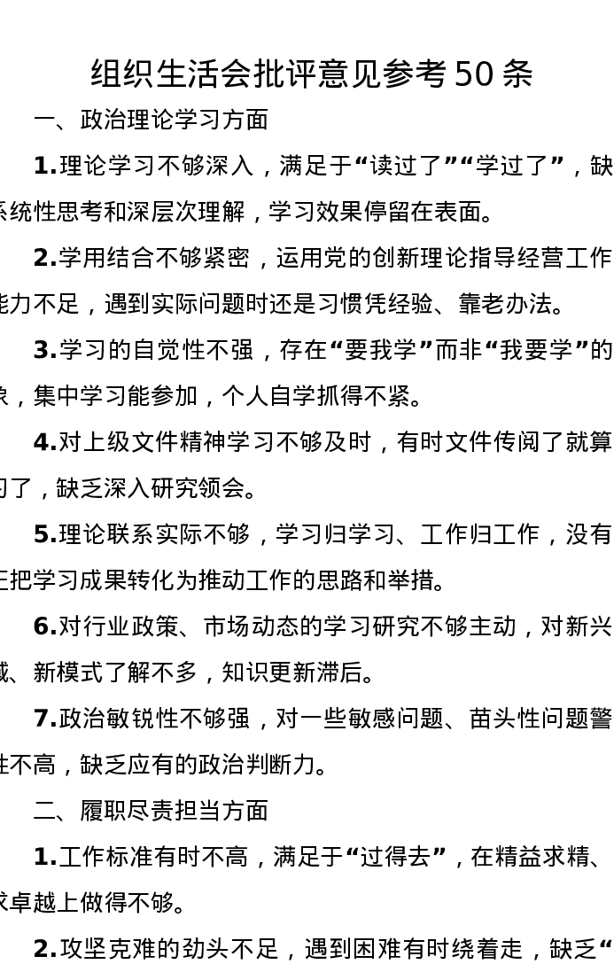 组织xxx批评意见参考50条
