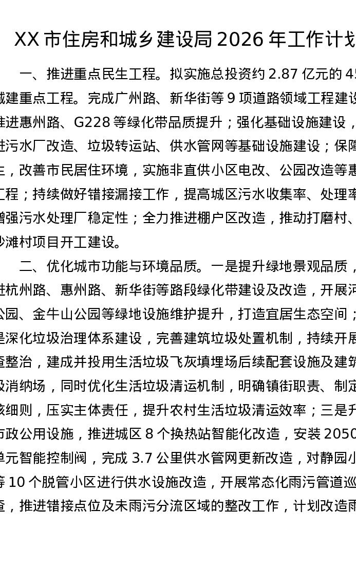 XX市住房和城乡建设局2026年工作计划