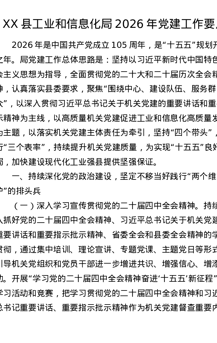 XX县工业和信息化局2026年党建工作要点