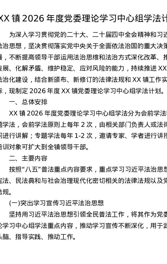 XX镇2026年度党委理论学习中心组学法计划