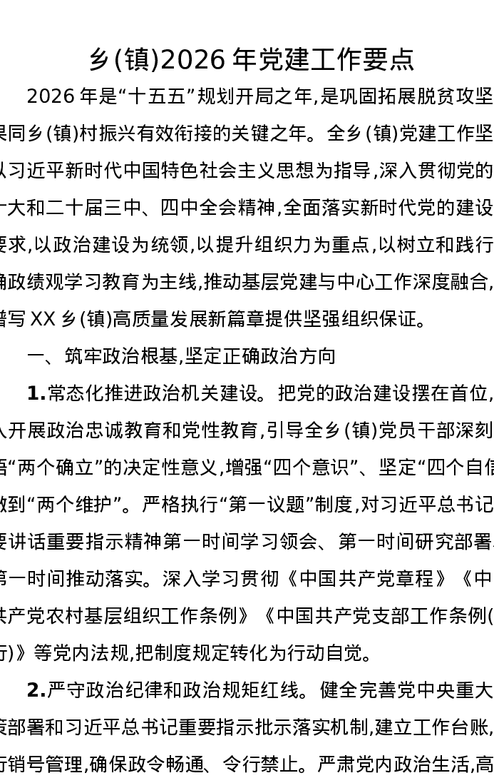 乡(镇)2026年党建工作要点