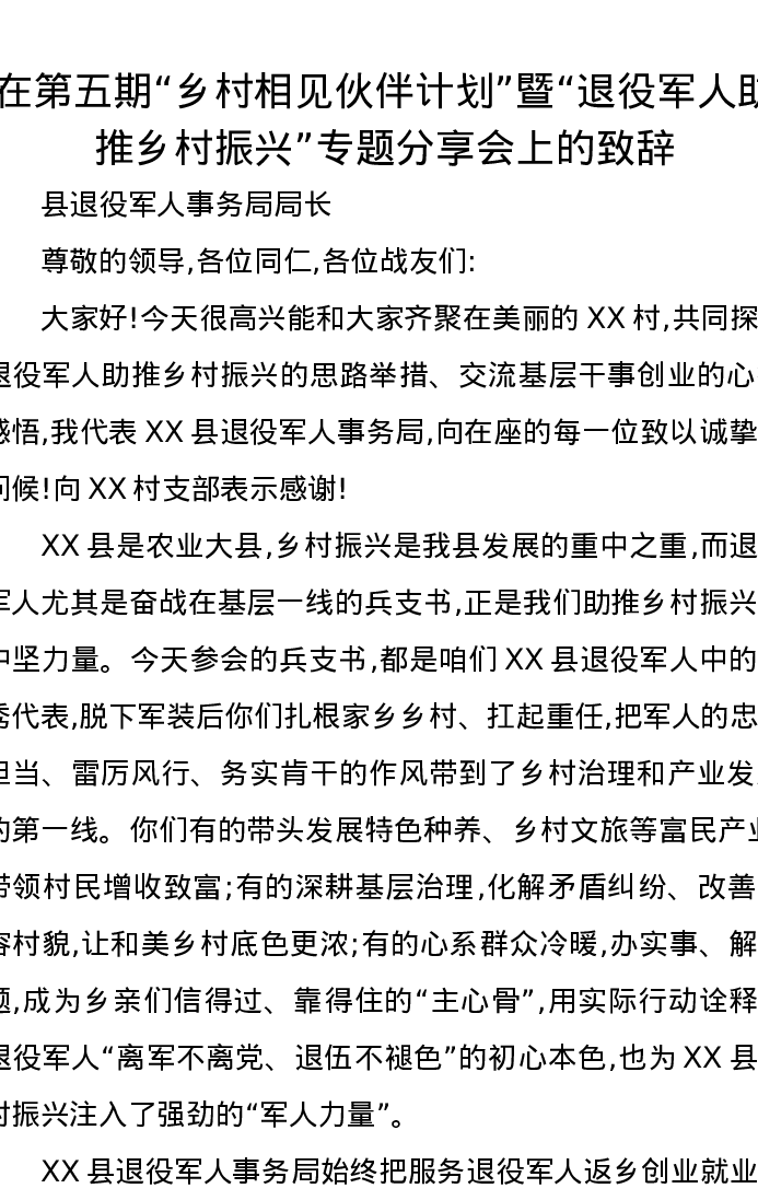 在第五期乡村相见伙伴计划暨退役军人助推乡村振兴专题分享会上的致辞