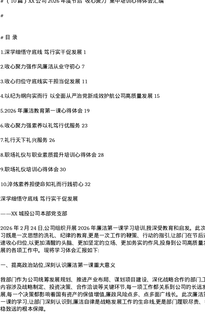 汇编:XX公司2026年度节后收心聚力集中培训心得体会10篇