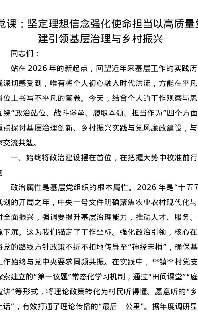 党课:坚定理想信念 强化使命担当 以高质量党建引领基层治理与乡村振兴