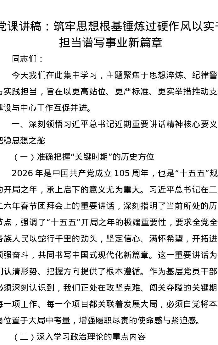 党课讲稿:筑牢思想根基 锤炼过硬作风 以实干担当谱写事业新篇章