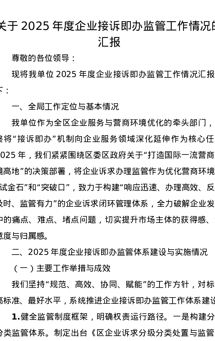 关于2025年度企业接诉即办监管工作情况的汇报