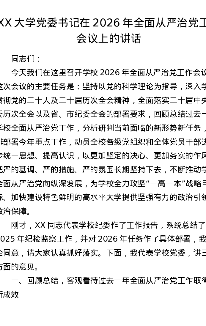 XX大学党委书记在2026年全面从严治党工作会议上的讲话3