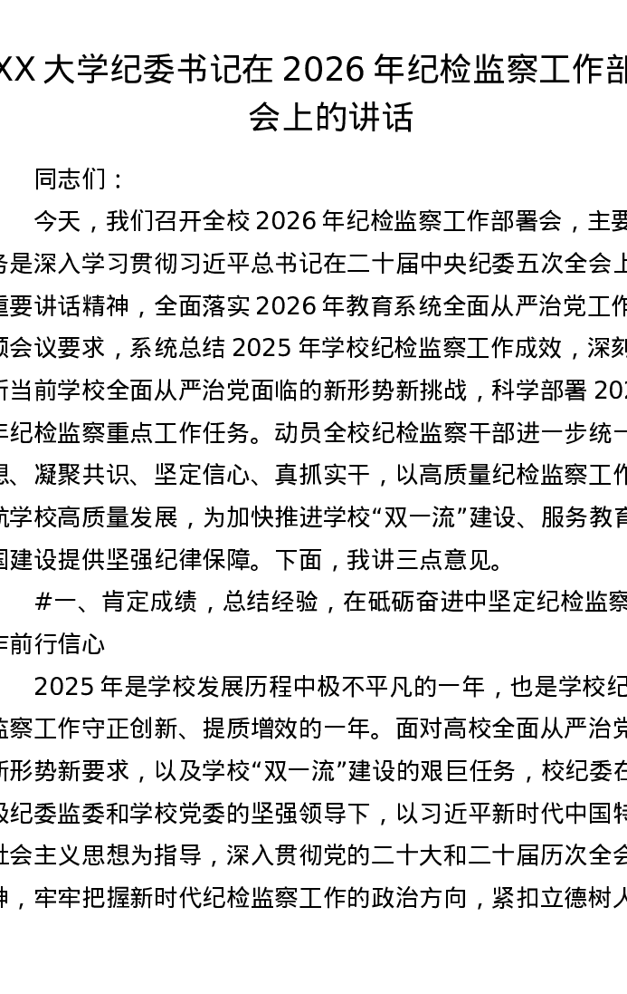 XX大学纪委书记在2026年纪检监察工作部署会上的讲话