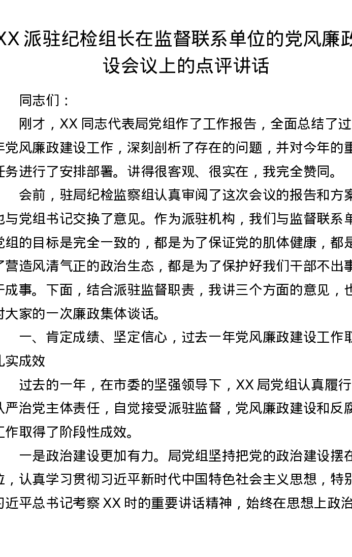 XX派驻纪检组长在监督联系单位的党风廉政建设会议上的点评讲话