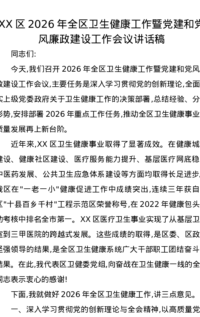 XX区2026年全区卫生健康工作暨党建和党风廉政建设工作会议讲话稿