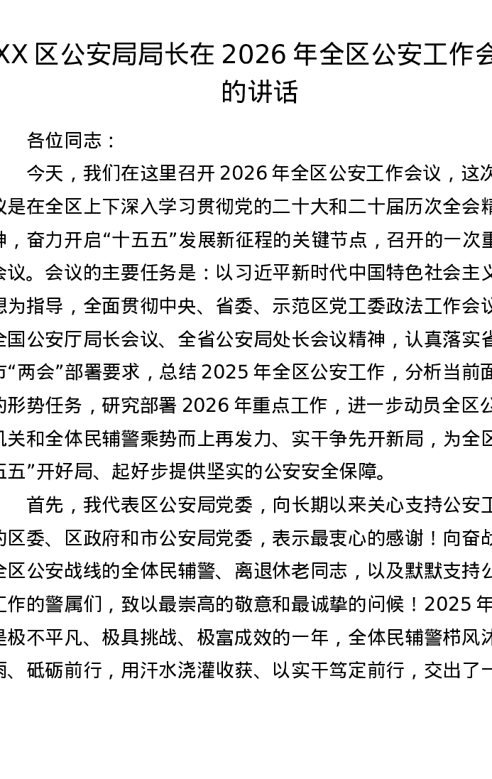 XX区公安局局长在2026年全区公安工作会上的讲话