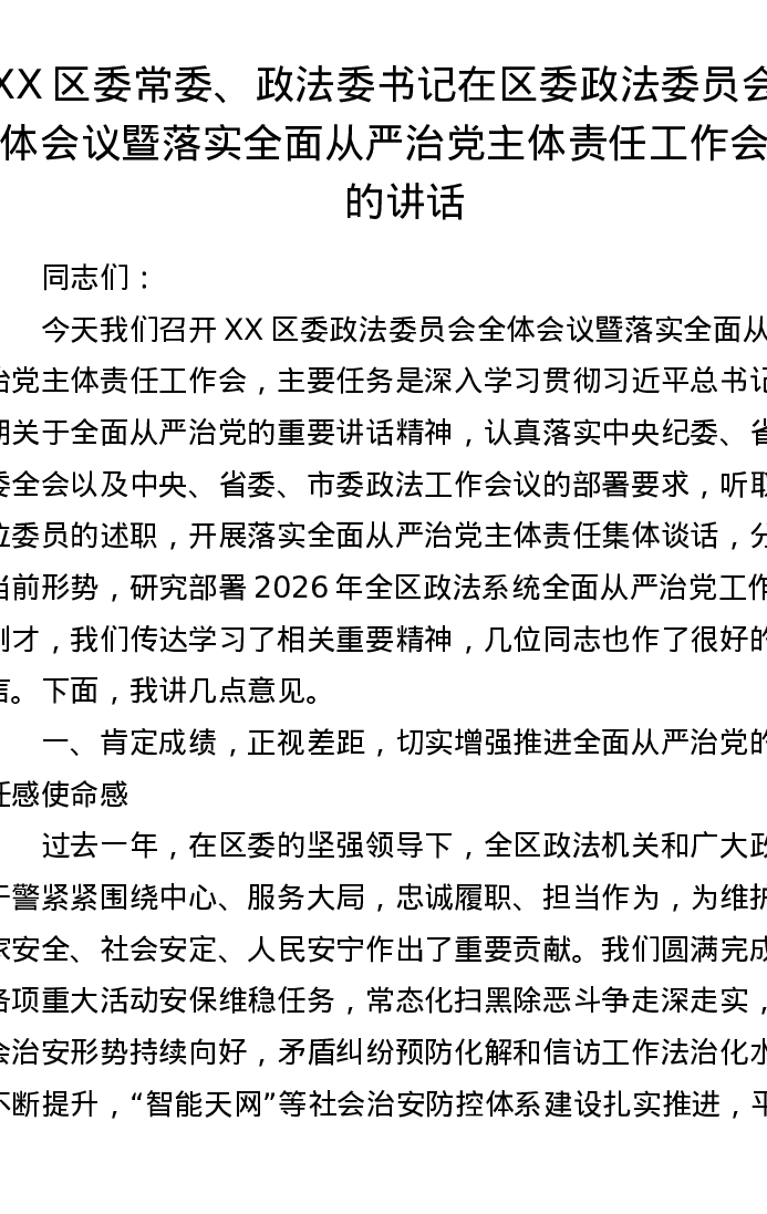 XX区委常委、政法委书记在区委政法委员会全体会议暨落实全面从严治党主体责任工作会上的讲话