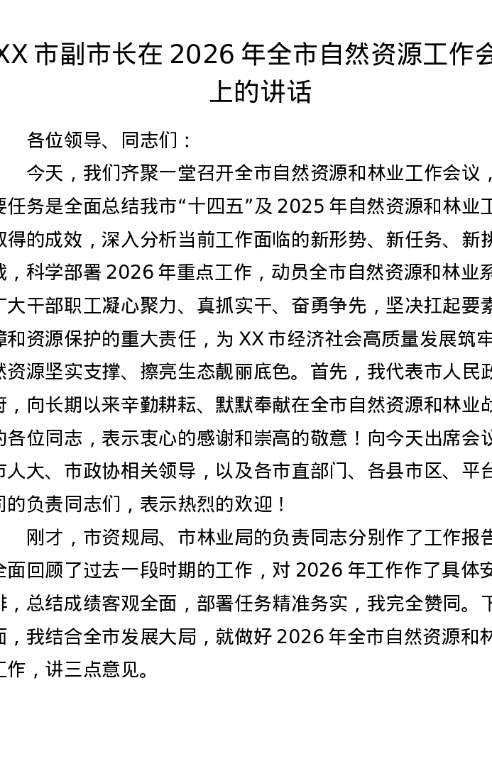 XX市副市长在2026年全市自然资源工作会议上的讲话3