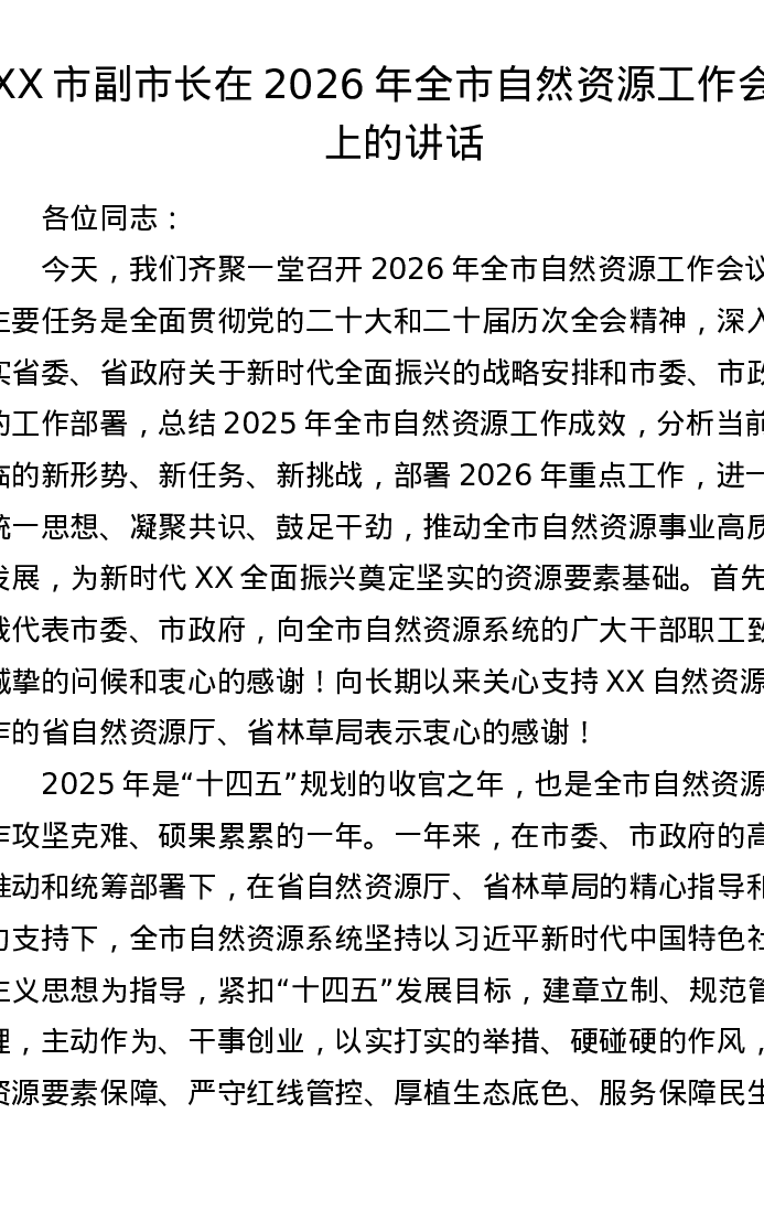 XX市副市长在2026年全市自然资源工作会议上的讲话4