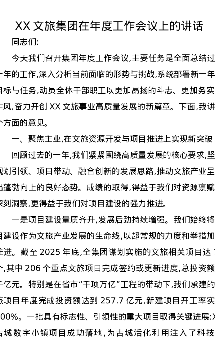 XX文旅集团在年度工作会议上的讲话