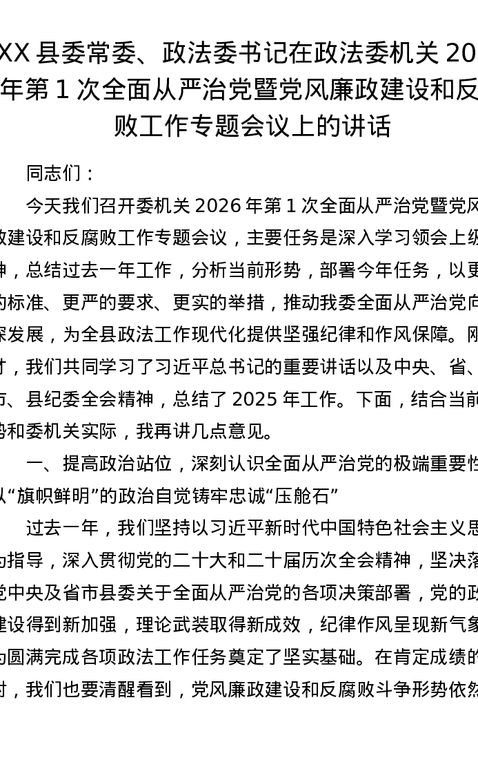XX县委常委、政法委书记在政法委机关2026年第1次全面从严治党暨党风廉政建设和反腐败工作专题会议上的讲话