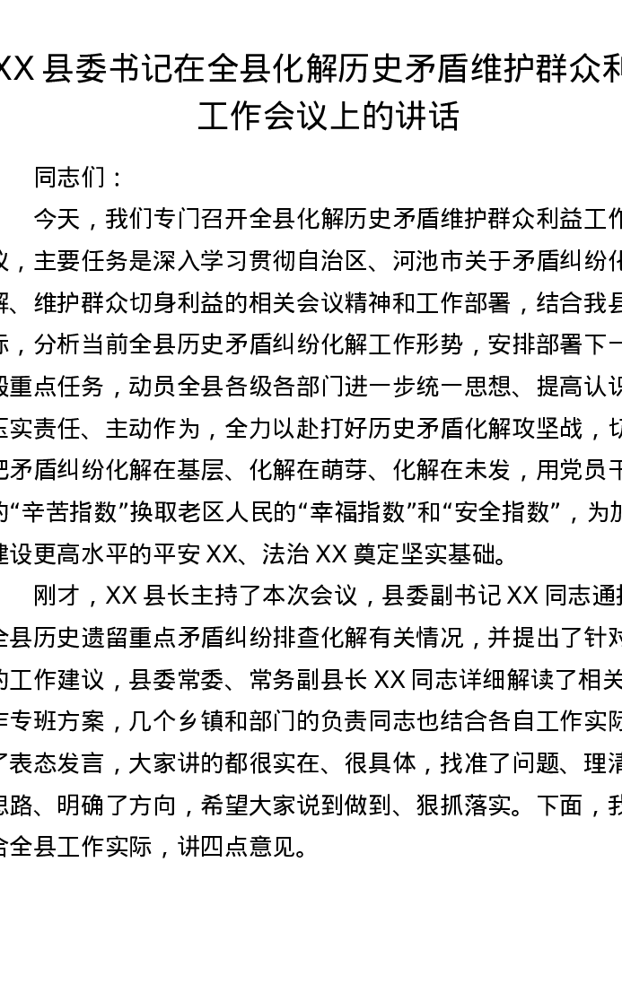 XX县委书记在全县化解历史矛盾维护群众利益工作会议上的讲话(6800字)