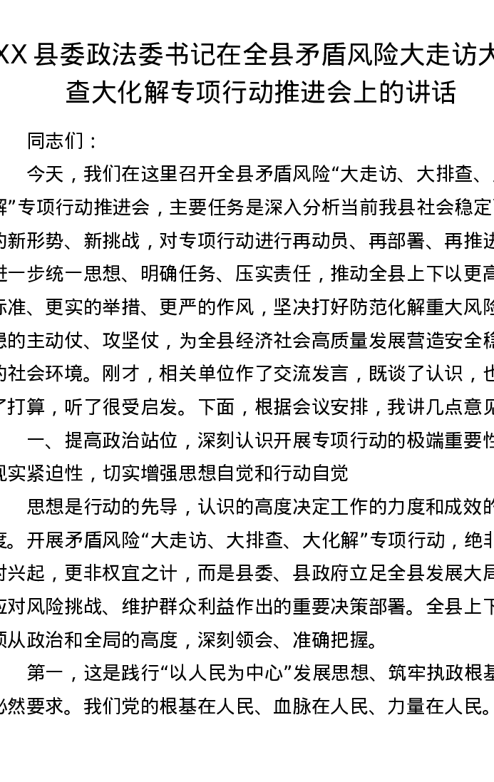 XX县委政法委书记在全县矛盾风险大走访大排查大化解专项行动推进会上的讲话2