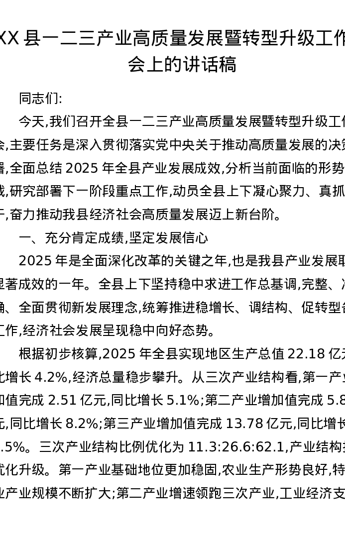 XX县一二三产业高质量发展暨转型升级工作大会上的讲话稿
