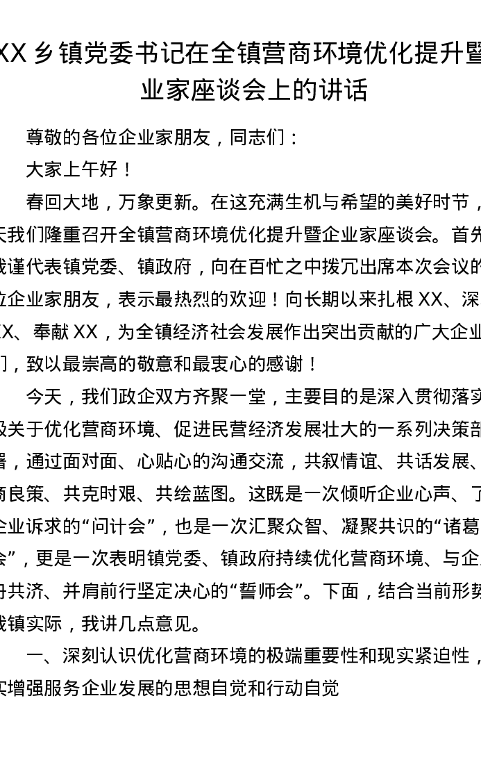 XX乡镇党委书记在全镇营商环境优化提升暨企业家座谈会上的讲话