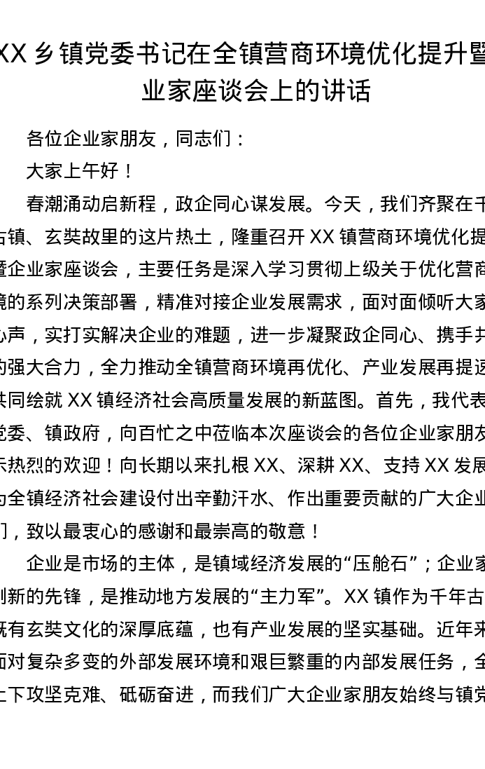 XX乡镇党委书记在全镇营商环境优化提升暨企业家座谈会上的讲话2