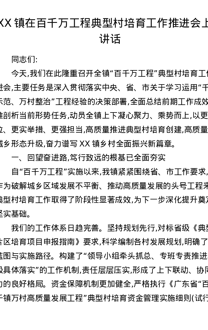 XX镇在百千万工程典型村培育工作推进会上的讲话