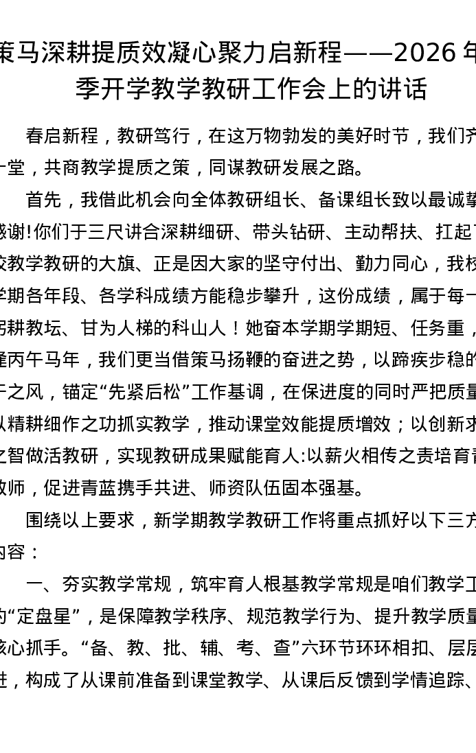 策马深耕提质效凝心聚力启新程——2026年春季开学教学教研工作会上的讲话
