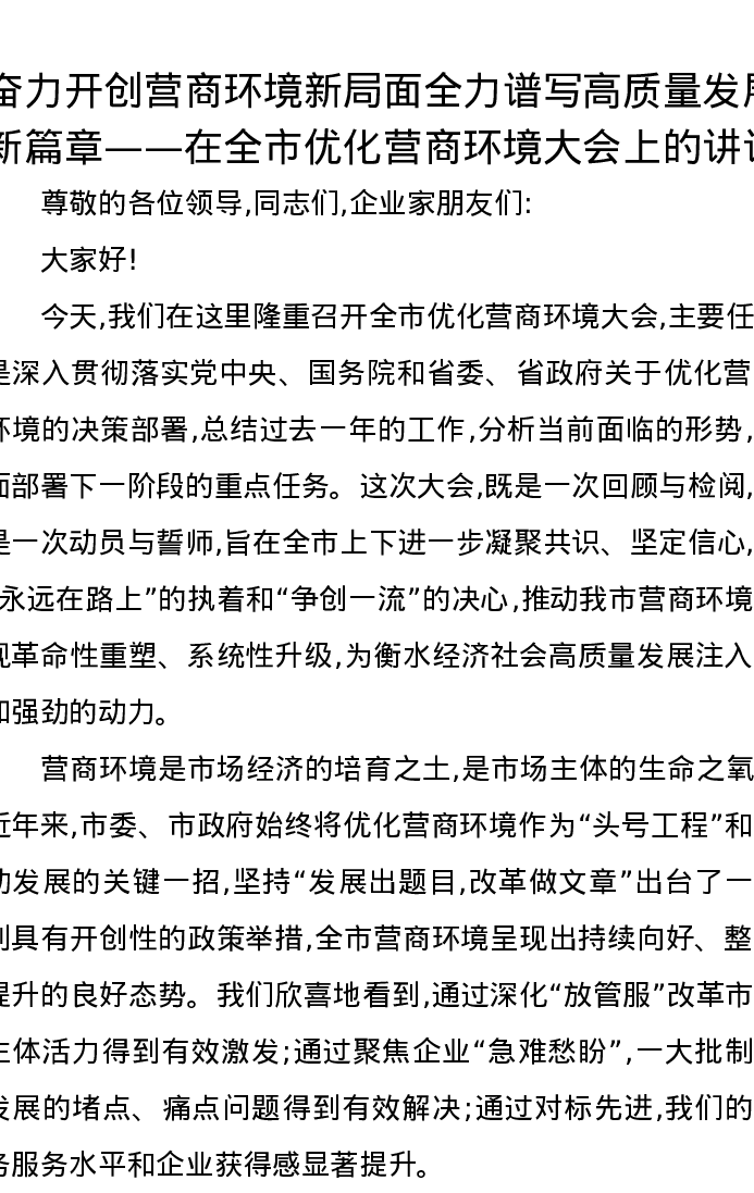 奋力开创营商环境新局面全力谱写高质量发展新篇章——在全市优化营商环境大会上的讲话