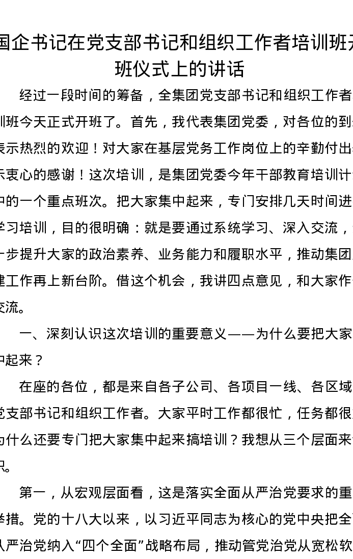国企书记在党支部书记和组织工作者培训班开班仪式上的讲话