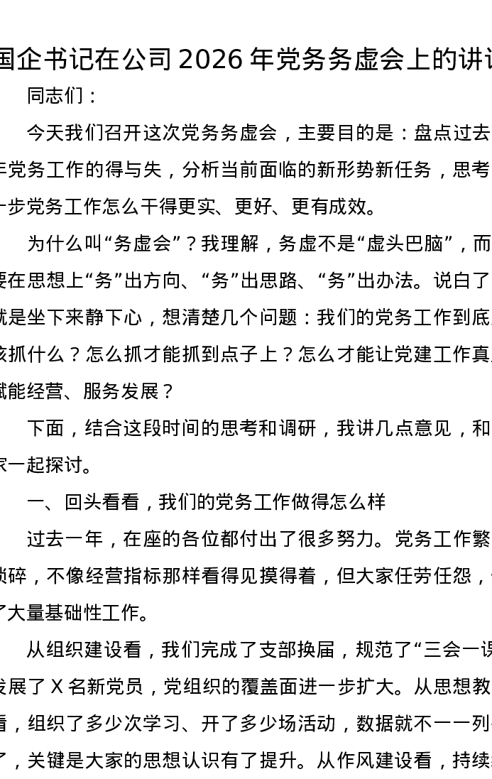 国企书记在公司2026年党务务虚会上的讲话
