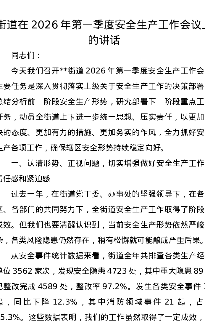 街道在2026年第一季度安全生产工作会议上的讲话