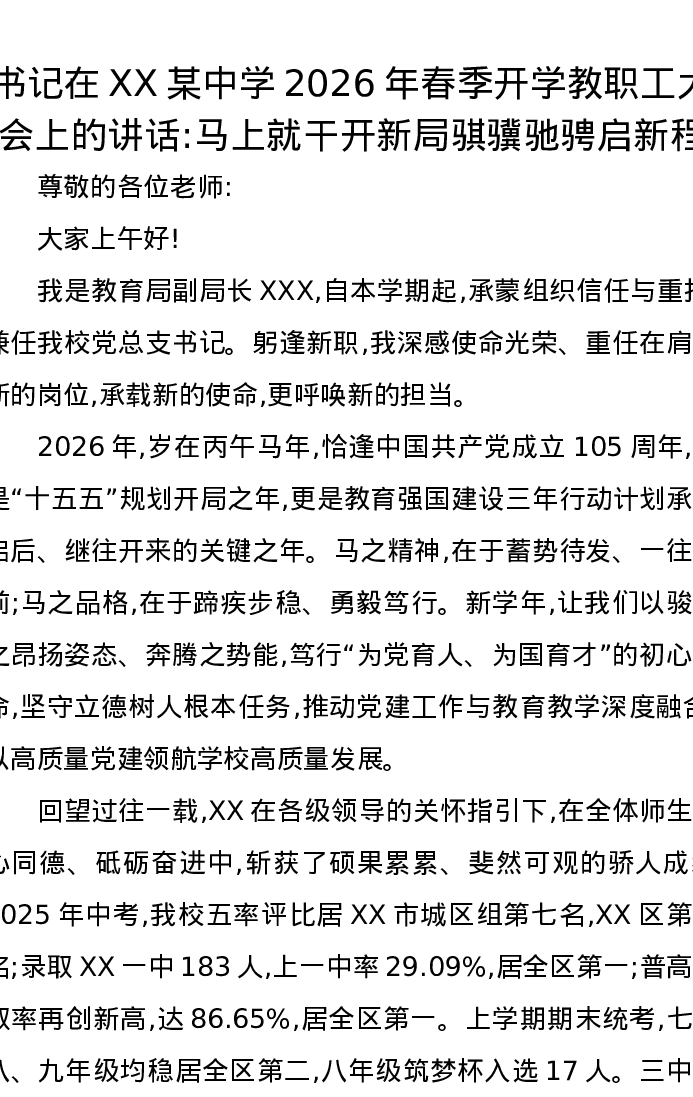 书记在XX某中学2026年春季开学教职工大会上的讲话:马上就干开新局骐骥驰骋启新程