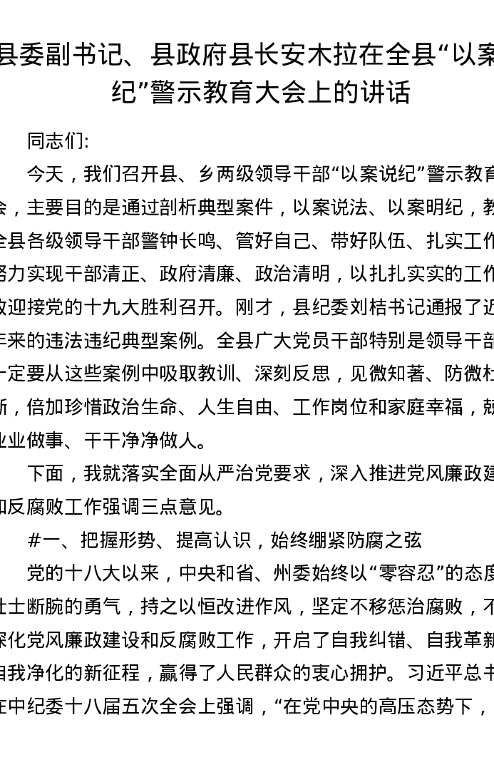 县委副书记、县政府县长安木拉在全县以案说纪警示教育大会上的讲话