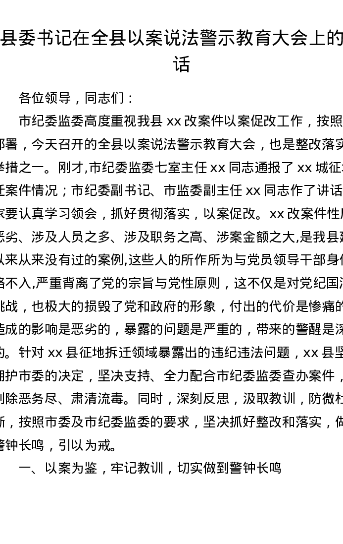 县委书记在全县以案说法警示教育大会上的讲话