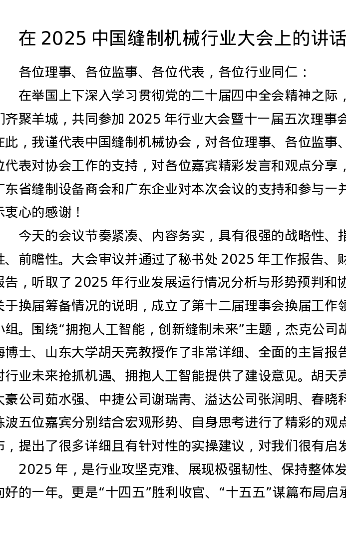 在2025中国缝制机械行业大会上的讲话