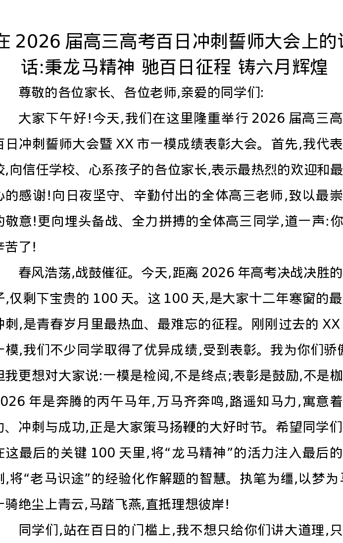 在2026届高三高考百日冲刺誓师大会上的讲话秉龙马精神 驰百日征程 铸六月辉煌