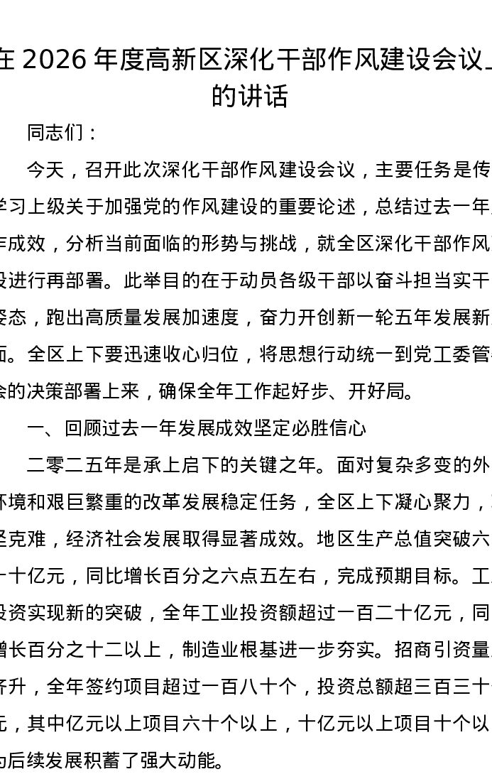 在2026年度高新区深化干部作风建设会议上的讲话