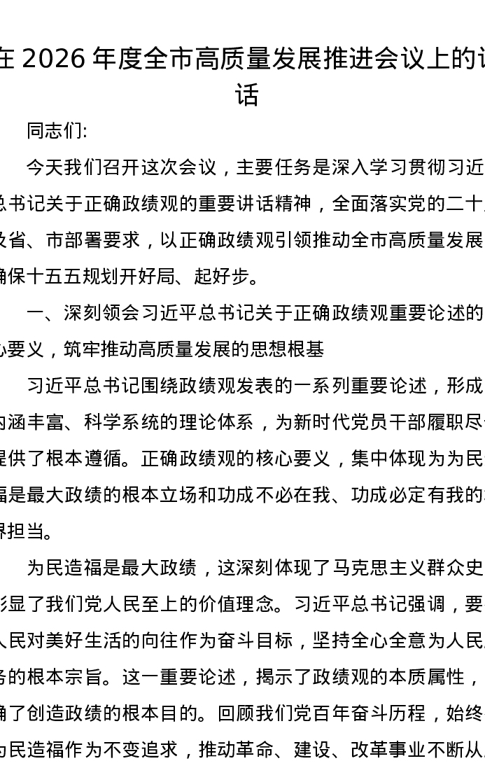 在2026年度全市高质量发展推进会议上的讲话